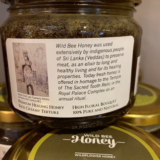 On a small shelf, next to the more affordable bottles of treacle syrup, were jars of raw Ceylon honey. The label read: “Wild Bee Honey was used extensively by indigenous people of Sri Lanka (Veddas) to preserve meat, as an elixir to long and healthy living and for its healing properties. Today fresh honey is offered in homage to the Temple of the Sacred Tooth Relic in the Royal Palace Complex as an annual ritual.”